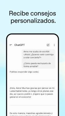 Ya sea que busques una chispa de inspiración creativa para idear el regalo de cumpleaños perfecto o la redacción de una tarjeta memorable, o si necesitas consejos personalizados para articular una respuesta delicada o explicar una situación compleja, ChatGPT está listo para asistirte. Se convierte en tu tutor personal, capaz de simplificar conceptos complejos como la electricidad para mentes curiosas, o de refrescar tu memoria sobre eventos históricos cruciales con facilidad. Además, es un aliado invaluable en el ámbito profesional, ideal para la lluvia de ideas en textos publicitarios o el desarrollo de un plan de negocios innovador.