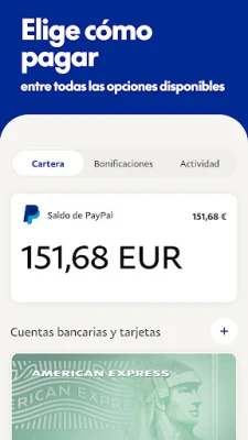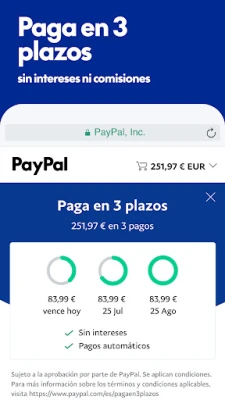 Tu experiencia de compra se eleva con PayPal. Olvídate de llevar carteras llenas; paga en persona escaneando códigos QR de manera rápida y sin contacto. Elige cómo prefieres pagar: vincula tus tarjetas de débito o crédito, o tu cuenta bancaria para una flexibilidad total. Recibe notificaciones instantáneas que te mantienen al tanto de cada gasto, protegiendo tus compras y facilitando la gestión de tus finanzas online. Con PayPal, también puedes consolidar y controlar todas tus suscripciones y facturas en un solo lugar. Y si necesitas un respiro financiero, "Paga en 3 plazos" te ofrece la opción de dividir tus compras, sujeto a aprobación y condiciones detalladas en nuestra web.